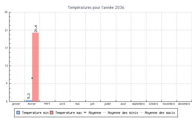 | fevrier | 5.3 °C | 6.2 °C | 20.4 °C | 15.7 °C | 10.2 °C | 6.0 km/h | 29.2 km/h | S |